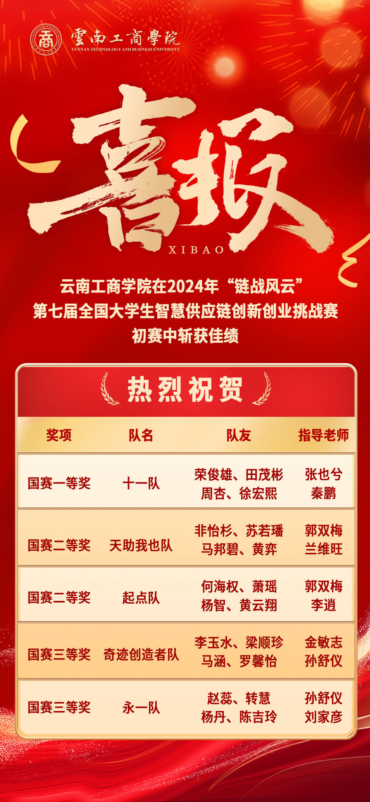近日,云南工商学院在2024年“链战风云”第七届全国大学生智慧供应链创新创业挑战赛初赛中,荣获国赛一等奖1项(晋级全国总决赛)、国赛二等奖2项、国赛三等奖2项。