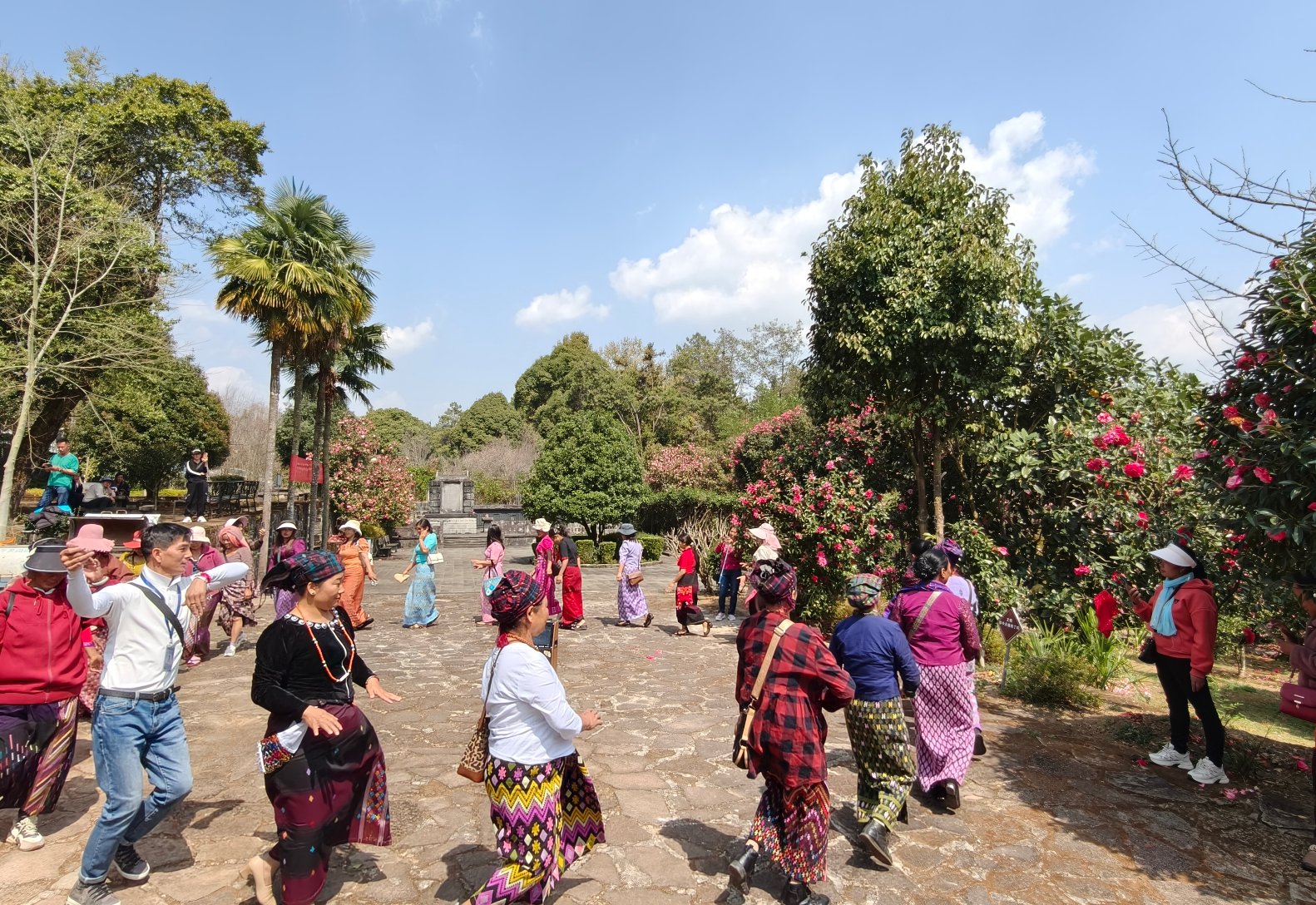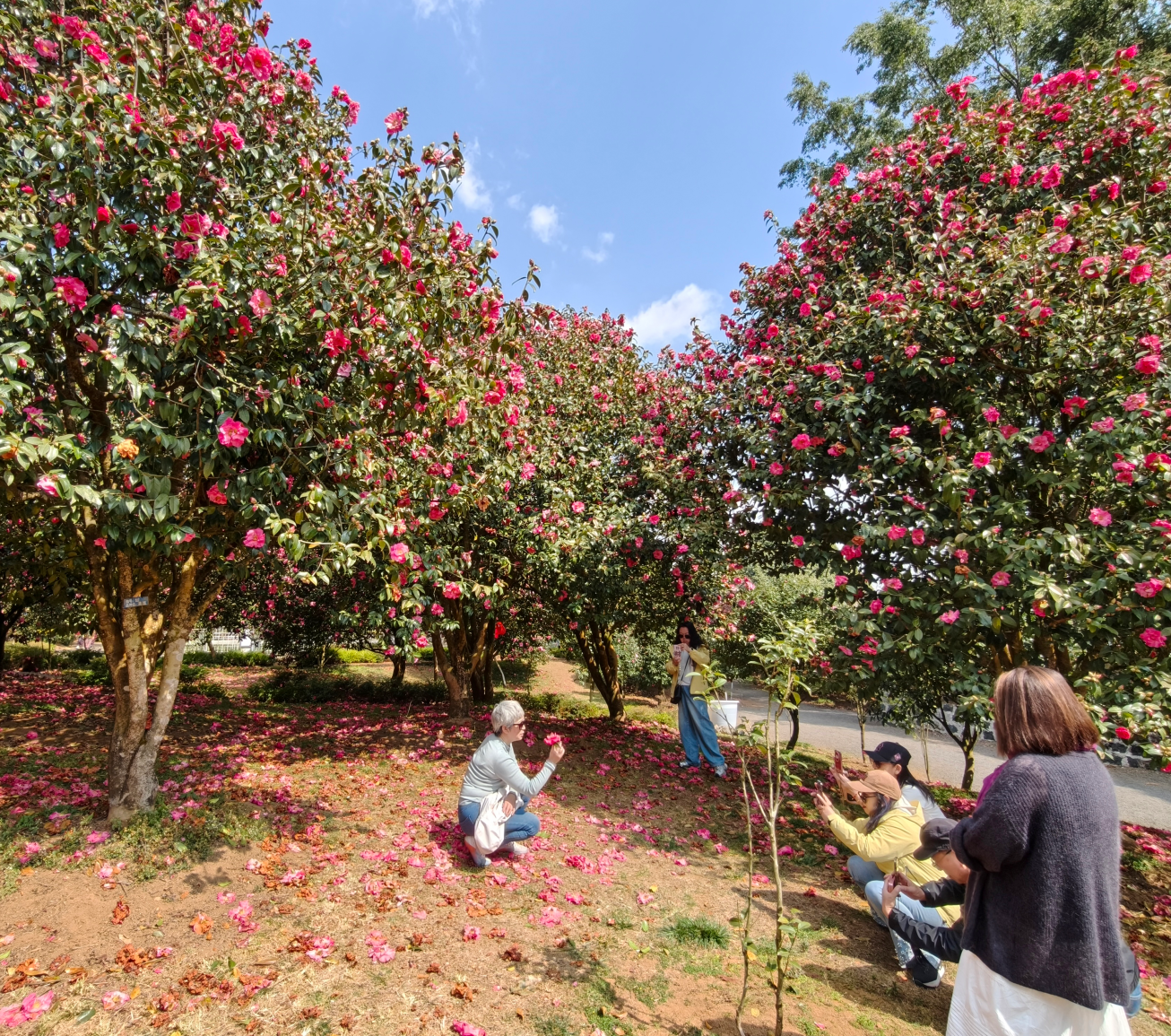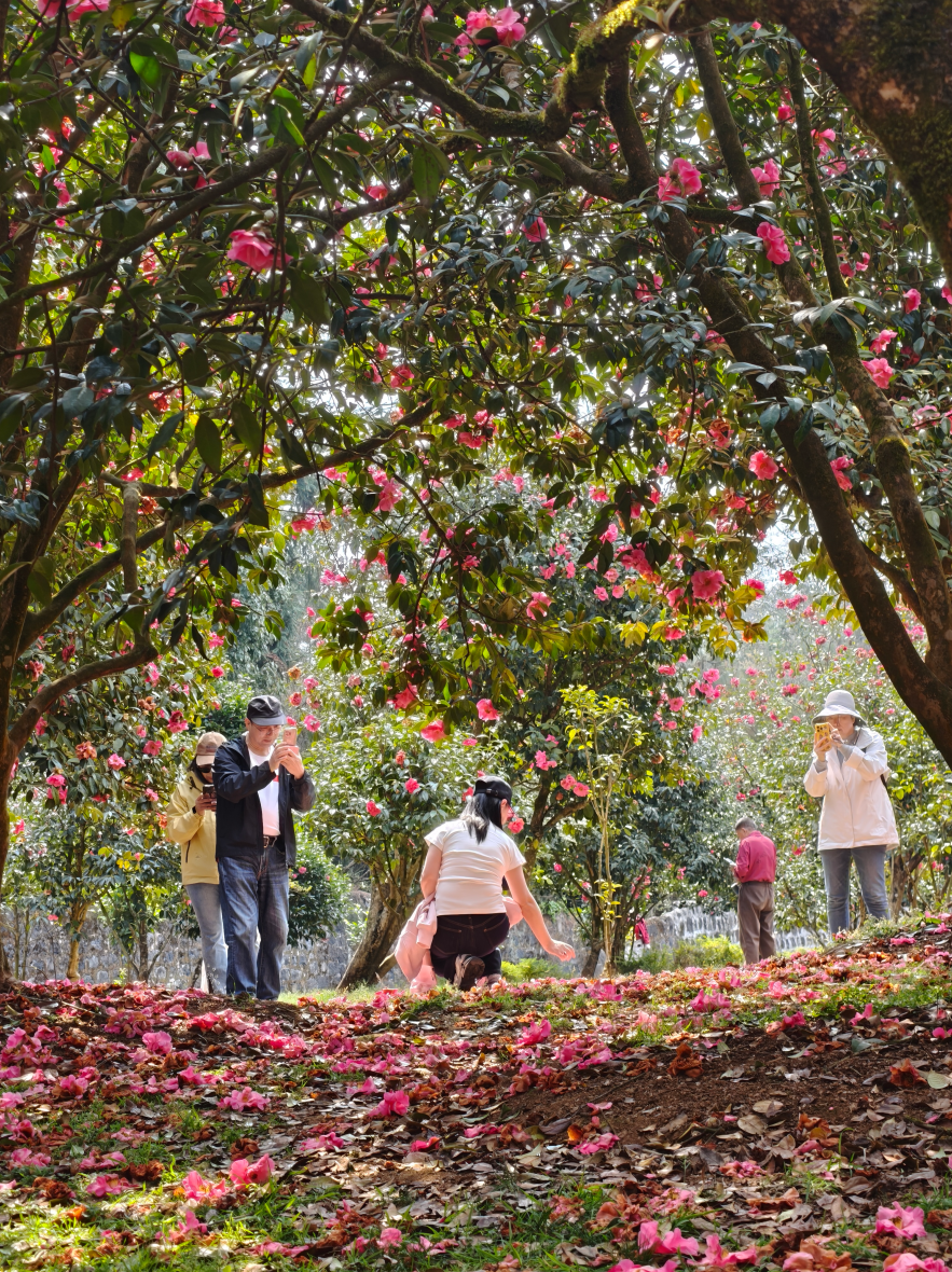 游客们穿梭在花海中,忙着拍照留念。孩子嬉笑奔跑,大人专注拍摄,老人惬意欣赏。在这,山茶花是视觉盛宴,更是心灵慰藉。