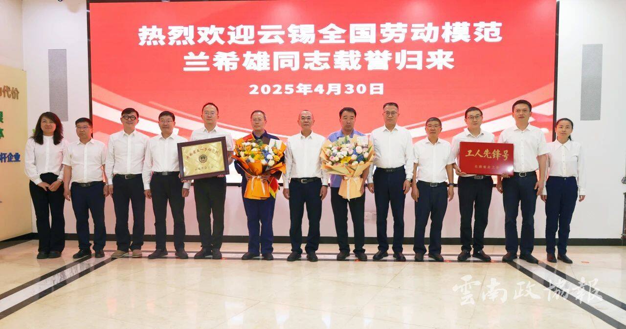 4月30日,云锡控股公司党委举行欢迎仪式,热烈祝贺参加党中央、国务院庆祝全国总工会成立100周年暨2025年全国劳动模范和先进工作者表彰大会,并受到表彰的全国劳动模范兰希雄载誉归来。控股公司党委书记、董事长孙勇出席仪式。