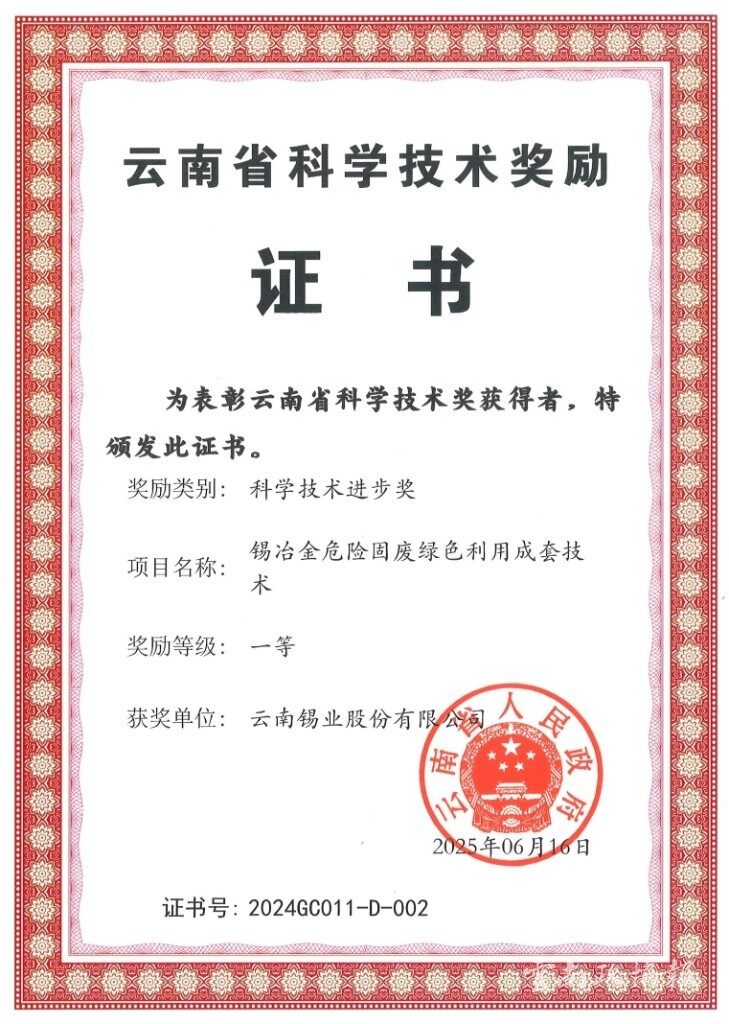 近日,2024年度云南省科学技术奖励大会在昆明举行。由昆明理工大学牵头、锡业股份参与的“锡冶金危险固废绿色利用成套技术”荣获云南省科技进步奖一等奖。