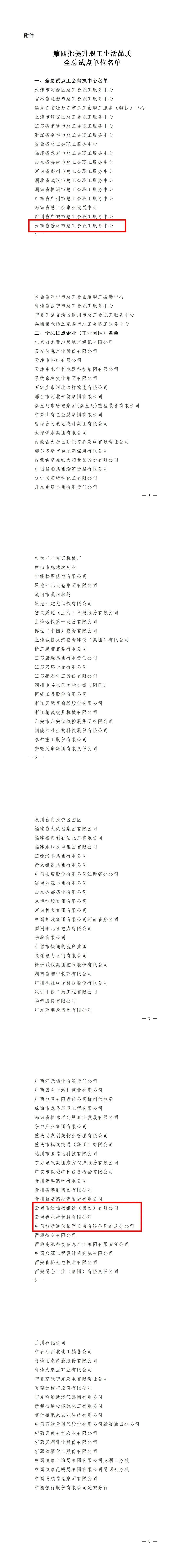 近日,全国总工会下发了《关于发布第四批提升职工生活品质全总试点单位名单的通知》,确定了20家工会帮扶中心、100家企业(工业园区)为第四批提升职工生活品质全总试点单位。云南共有4家单位入选,其中,普洱市总工会职工服务中心被确定为工会帮扶中心全总试点,云南玉溪仙福钢铁(集团)有限公司、云南锡业新材料有限公司、中国移动通信集团云南有限公司迪庆分公司被确定为企业(工业园区)全总试点。下一步,省总工会将按照全国总工会试点任务要求,坚持以职工为中心的工作导向,有序推进试点工作。